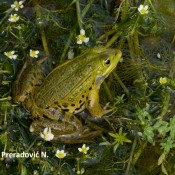 Skadarska žaba Pelophylax shqipericus (=Rana shqiperica) zvanično je opisana 1987. godine na osnovu primjeraka jedinki iz Virpazara (Hotz i sar. 1987). Pripada grupi zelenih žaba. Tijelo joj je malo do srednje veličine (do 7.5 cm) sa gornje strane svijetlo smeđe ili u različitim nijansama zelene boje, često sa krupnim tamnim mrljama i tankom svijetlom linijom po sredini leđa. Bokovi i unutrašnja strana butina su sumporno-žutim mrljama. Mužjaci u uglovima usta imaju bjeličasto sive do maslinaste vokalne kese (rezonatore).
